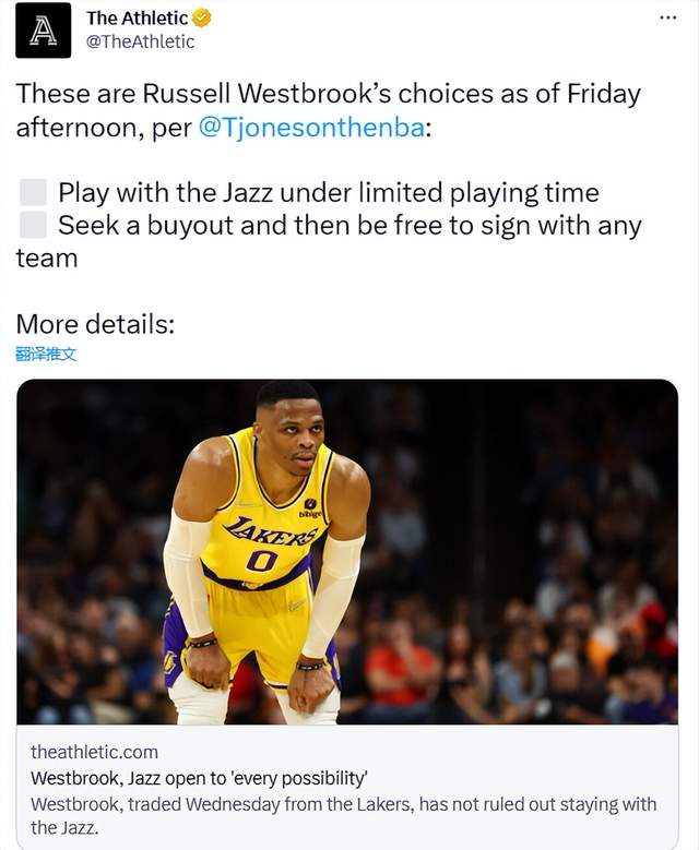 178直播讯02月11日,在威少被交易到爵士之后,关于他可能被爵士买断的消息不绝于耳。而来自爵士跟队记者托尼·琼斯报道,拉塞尔已经和爵士完成会面。而爵士方面的做法,可以说让湖人管理层汗颜。他们给予了威少足够的尊重,将最终决定的主动权完全交给了威少,并且没有给威少做决定设置最后期限。不过爵士明确表示,威少如果决定留队,将获得很有限的登场时间。看起来,威少大概率会离开爵士。