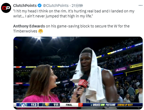 与步行者一战,开场仅仅只打了5秒,爱德华兹就不幸崴脚,一瘸一拐离场,随后他火线回归,上半场15投7中拿到15分;下半场,爱德华兹爆砍29分,末节关键时刻,最后108秒包揽8分,华子晃倒内史密斯命中关键球,最后时刻,华子两罚一中,却上演逆天制胜盖帽——内史密斯持球杀到禁区,绝平上篮惨遭大帽,华子高高跃起,后脑勺磕到篮筐,完成惊天制胜盖帽。