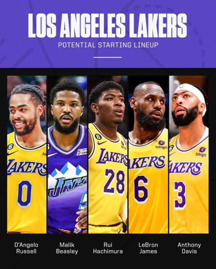 湖人队潜在首发五虎是詹姆斯、浓眉、拉塞尔、八村垒和马利克-比斯利。