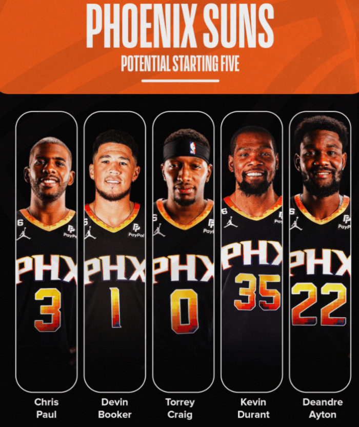 到目前为止,杜兰特已经三次换队——2016年,杜兰特决定以自由球员身份加盟勇士,组成宇宙勇统治联盟三年,杜兰特三年两次夺冠,两次夺得FMVP;2019年杜兰特决定二,离开勇士并且联手欧文加盟篮网,目标总冠军,可4年仅仅赢过一轮季后赛;2023年杜兰特决定三,离开篮网加盟太阳,如此举动轰动全联盟,联手布克、保罗和艾顿组成豪华战舰冲击总冠军。