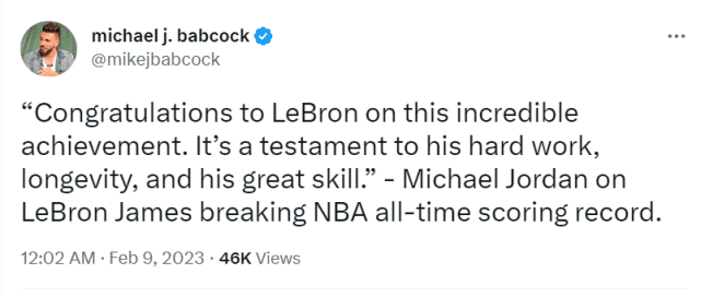 多年以来,关于乔丹和詹姆斯谁是GOAT的争议不断,也是球迷们最喜欢讨论的话题。成为历史得分王,让詹姆斯的成就履历上多了浓重的一笔。詹姆斯再次表态,他认为自己就是篮球史上最伟大的球员,而作为“对手”,乔丹选择向詹姆斯表示祝贺。