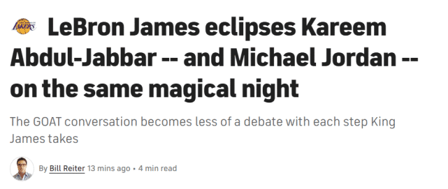 CBS篮球记者Bill Reiter撰文盛赞38岁超巨,认为詹姆斯在同一个魔幻般的夜晚,超越了贾巴尔和乔丹。前者的超越,是历史得分王的更迭,而后者的超越,显然是指GOAT的竞争。