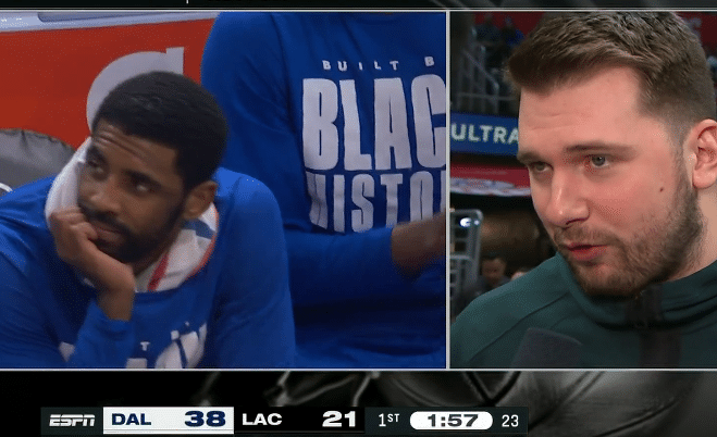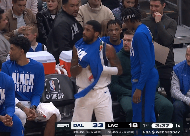 4分08秒,欧文下场休息,和替补席教练组以及新队友击掌,然后欧文穿上T恤坐在东契奇附近;欧文下场后,独行侠火力不减,第一节41-25领先快船多达16分。