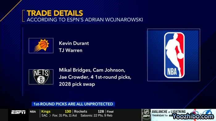 篮网送走杜兰特和TJ-沃伦,从太阳得到布里奇斯、卡梅隆-约翰逊、克劳德、四个首轮签和2028年的选秀权互换;据悉篮网得到的是2023年、2025年、2027年和2029年无保护首轮签。