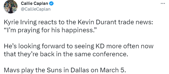 对于杜兰特被交易到太阳,欧文笑着回应:我祈祷他可以过得开心,我们这一年聊得很多。我觉得他从没对我生气过,我也从未对他生过气。我很高兴他离开了那个地方。