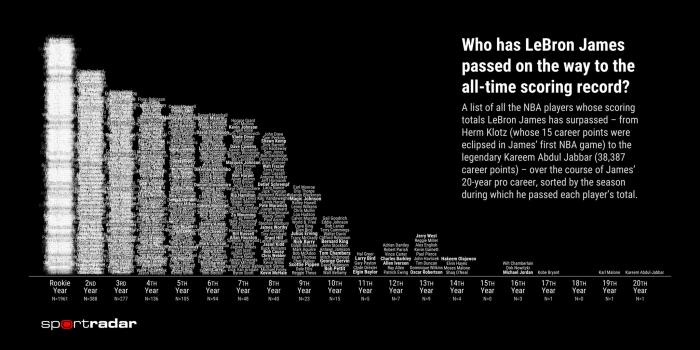 詹姆斯生涯20年,总得分历史第一,总进球数历史第二,三分命中数历史第九,1402场得分上双(连续1140场得分上双历史第一)、生涯单场最高61分,1173场得分20+,531场得分30+,74场得分40+,14场得分50+,单赛季场均最高31.4分,1次得分王。