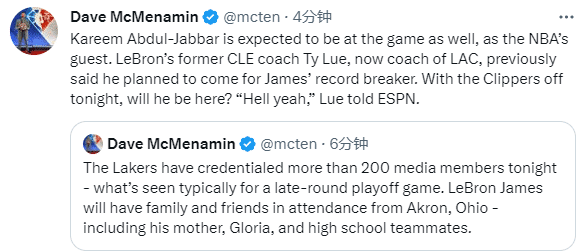 贾巴尔作为NBA嘉宾来到现场,泰伦-卢也来到现场,此前泰伦-卢表示他要亲眼见证詹姆斯破纪录,而今天快船队没有比赛,卢指导不用请假了。