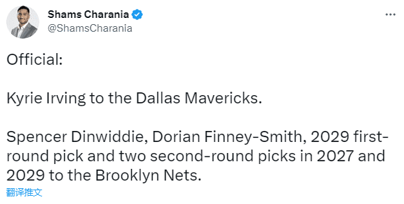 篮网把欧文和大莫里斯交易到独行侠,得到丁威迪、芬尼-史密斯、2029年不受保护首轮选秀权、2027年和2029年次轮选秀权。