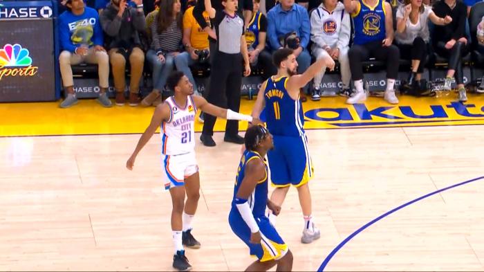 勇士开场被雷霆打出9-2攻势,随后汤普森开始发力,跑位中投得分,外线点飞防守轰进三分,汤普森继续跳投得分,迎着干扰连中3记三分,第一节打满12分钟10投7中独砍18分。