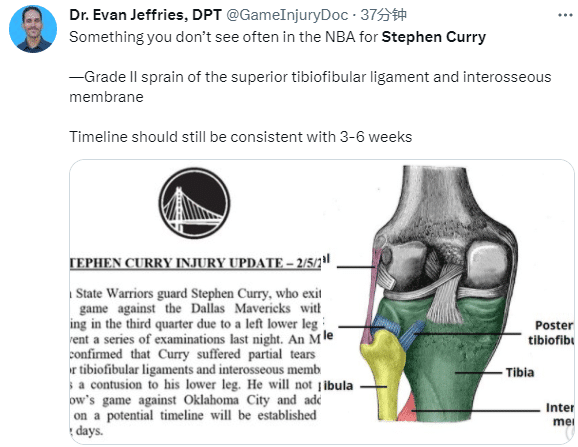库里将会伤停多久?据名记shams报道,库里因左腿伤势预计将会缺席数周,勇士记者则表示他将缺席今年的全明星赛,医学专家Evan Jeffrier表示库里的伤情在NBA并不常见,胫腓上韧带和骨间膜二级扭伤,预计将会缺席3-6周才能重返赛场。