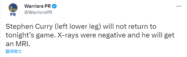 178直播02月05日讯 ,在勇士和独行侠比赛中,勇士球星库里的左腿膝盖不幸受伤,一瘸一拐离场返回更衣室,勇士官宣库里左小腿受伤退赛,X光检查成阴性,明天接受核磁共振检查,医学专家担忧库里膝盖韧带扭伤。