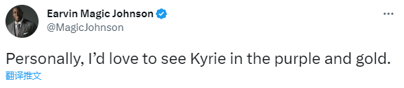 湖人名宿魔术师发推招募欧文,发推写道:就我个人而言,我很想看到欧文穿上紫金战袍。