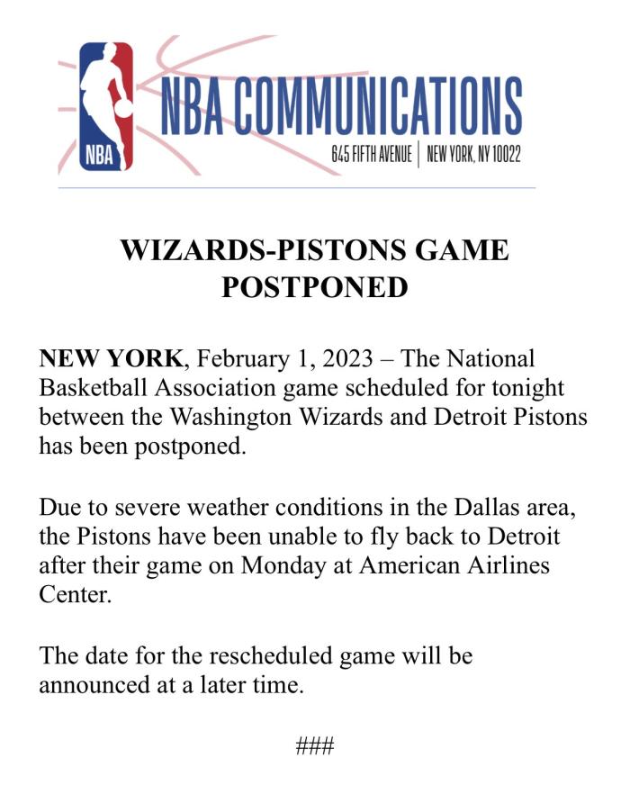 NBA官方宣布,由于恶劣的天气条件导致活塞无法及时返回底特律,因此今日与奇才的比赛被推迟延期,据报道,活塞队因冬季风暴航班无法起飞而滞留达拉斯。