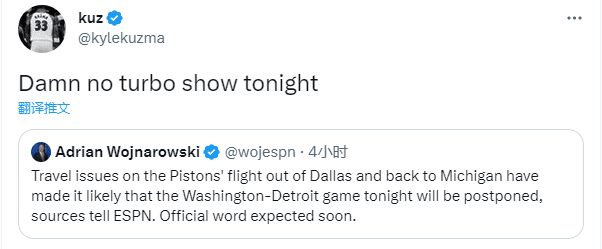 此前活塞客场105-111不敌独行侠。按照原本的赛程,活塞应该在今天上午八点主场迎战奇才;由于比赛因意外事件被延期,奇才球员库兹马发推抱怨。