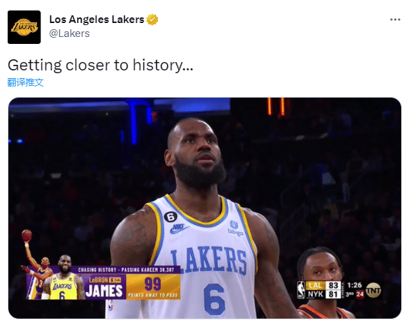 下半场,第三节詹姆斯终于命中三分球,外线终于开张,进攻端高举高打并且打成2+1,随着本场已经拿到18分,詹姆斯距离超越贾巴尔仅差99分,湖人官方晒出如此一幕,转播方为老詹破纪录而倒计时。