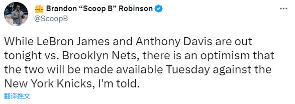 178直播01月31日讯 ,据名记Brandon Robinson报道,詹姆斯和浓眉预计将会出战下一场与尼克斯的比赛;换言之,詹眉都不会缺席很久,预计明天复出战尼克斯;此前哈姆曾表示浓眉休战是湖人计划内的事,詹姆斯则是因脚特别酸痛才休战的。
