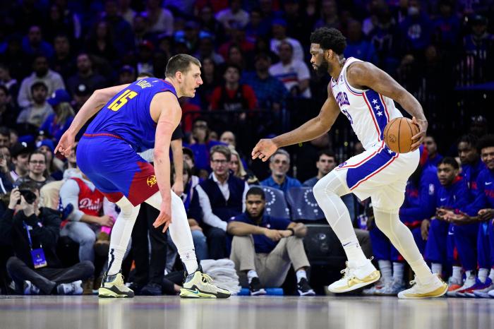 赛后,恩比德拥抱约基奇,联盟两大中锋有说有笑相互致意。