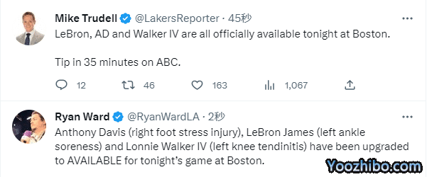此前詹姆斯(左脚踝酸痛)被列为出战成疑,赛前热身后确定出战,老詹热身时遭现场球迷狂嘘;浓眉的状态也升级为可以出战,詹眉远赴波士顿挑战凯尔特人。