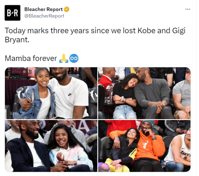 Bleacher Report晒出组图怀念科比,写道:“曼巴永恒。”
