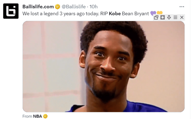 Ballislife也晒出了科比的比赛集锦,写道:“我们在三年前的今天失去了一位传奇。安息吧,科比-布莱恩特。”