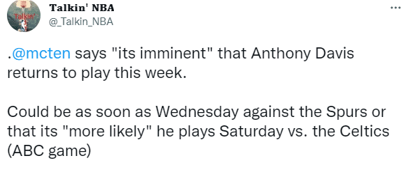 Dave McMenamin表示:自从浓眉受伤以来已经接近六周时间了,他非常非常接近回归,我被告知,最快可能在明天对阵马刺的比赛中复出,但更有可能他会在本周日对阵波士顿凯尔特人队时复出,那是回归的好时机,球队正在努力让他准备好重返球场。
