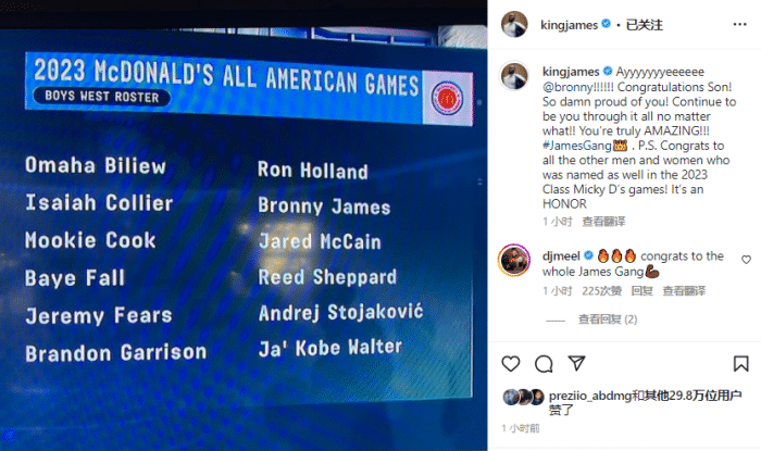 18岁的布朗尼正式2023年入选全美高中明星赛,詹姆斯夫妇都为布朗尼骄傲,詹姆斯更新社媒,写道:恭喜你儿子!真为你骄傲!无论发生什么,都要继续做你自己!!你真是太棒了#詹姆斯帮;PS:祝贺所有入选2023年麦当劳全美明星赛的球员!这是一个荣誉。