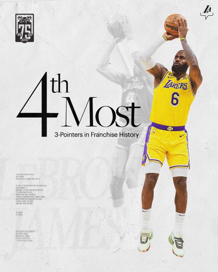 6、詹姆斯成为湖人队史三分命中数第四多的球员