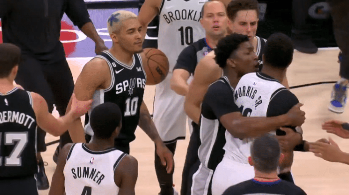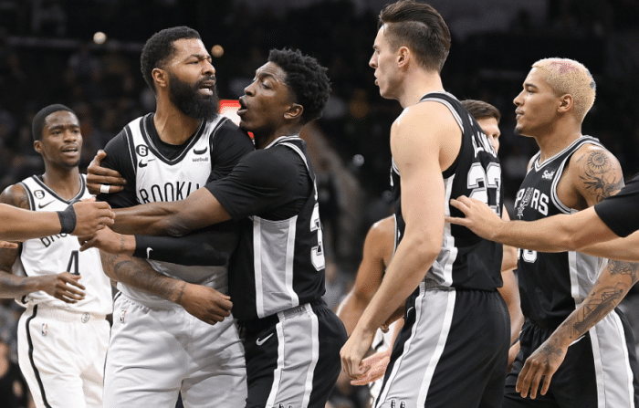 178直播01月18日讯 ,NBA常规赛篮网客场对阵马刺,杜兰特和欧文都因伤缺席比赛,第二节场上发生冲突事件,索汉恶犯拽倒大莫,两人抱摔引冲突,篮网悍将吃到技术犯规。