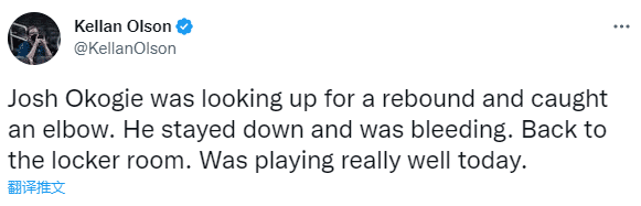 178直播01月17日讯 ,在太阳和灰熊比赛中,太阳又伤一员大将,奥科吉遭艾顿误伤,被肘击到鼻子,倒地不起血染赛场,最终太阳宣布奥科吉因鼻子受伤退出本场比赛。