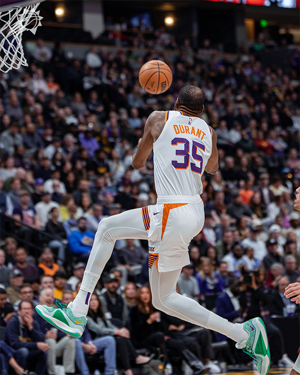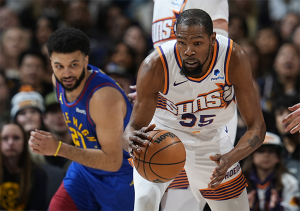下半场,太阳第三节5-0领先到20分,随后杜兰特无解中投以及造杀伤罚球得分,阿伦连中三分对飚掘金,可打着打着杜兰特连续四投不中,再加上努尔基奇5犯被迫下场,掘金一波12-4追到9分,杜兰特压哨三分打铁,太阳领先9分进入末节,杜兰特单节9中2仅6分。