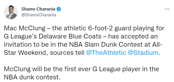 178直播01月14日讯 ,据名记shams报道,湖人旧将马克-麦克朗已经接受参加NBA扣篮大赛,麦克朗承诺参加扣篮大赛创造历史,成为史上第一位参加扣篮大赛的发展联盟球员;目前扣篮大赛4人名单已确定三席,另外两位参赛者是开拓者新秀夏普和火箭名宿之子小马丁。