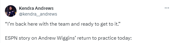 归队训练后维金斯表示:我必须照顾好我必须照顾的事情,然后在我认为合适的时候回来,这就是我的感觉。我和球队一起训练,我准备好了。