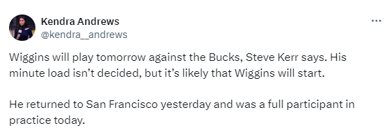 由于处理严重的家庭事务,维金斯请假离队并且连续缺席了4场比赛,期间勇士3胜1负,上一场比赛勇士52分惨败凯尔特人;如今时隔一周,维金斯终于回来了。