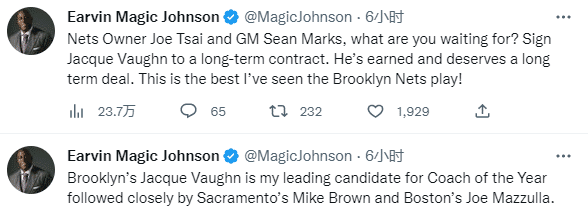 178直播01月12日讯 ,湖人名宿魔术师约翰逊发推谈到篮网现状,表示篮网是凯尔特人进入总决赛的最大威胁,盛赞欧文并且呼吁篮网赶紧续约主帅沃恩。