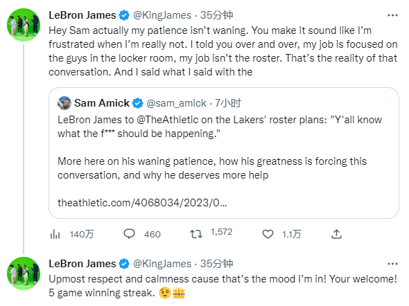 詹姆斯转发名记Sam Amick的报道,发推写道:嘿,山姆,实际上我的耐心并没有减弱。你说得好像我很沮丧,实际上我并不沮丧。我一遍又一遍地告诉你,我的工作是专注于更衣室里的队友,而不是球队名单。这就是那次对话的真实情况,我是带着最大的尊重和冷静接受采访,因为那就是那时我的心情不客气!5连胜(笑脸+王冠表情)