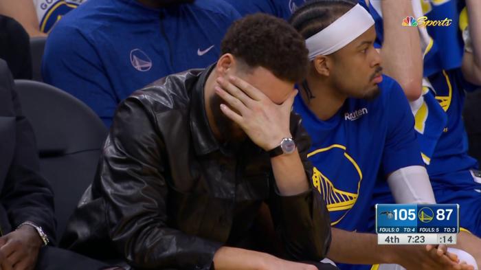 下半场,勇士第三节被魔术拉开分差,末节一直落后,追分时普尔投出离谱的空位三分三不沾,兰姆下半场也失灵,最终勇士输掉比赛;末节镜头给到勇士替补席,看到球队落后两位数,汤普森沮丧地捂脸不想看比赛,库里一脸落寞十分无奈;另外比赛还没结束,格林提前离场