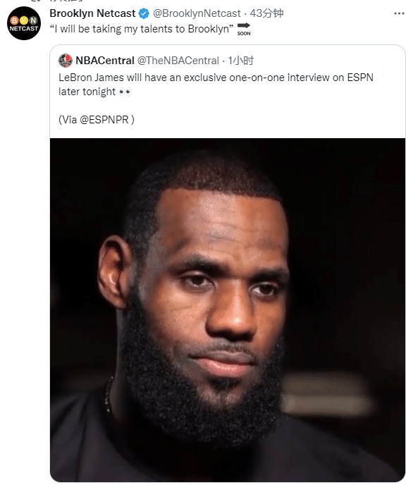 ESPN官方为一段球员专访特意发布媒体公告是很罕见的行为,如此声明引热议,美媒hoops表示外界希望詹姆斯今天向湖人提前离队申请;球迷们纷纷晒P照,希望詹姆斯加盟自家主队;有球迷希望詹姆斯加盟勇士,有球迷希望詹姆斯加盟尼克斯,篮网媒体转发报道并调侃:我将把天赋带到布鲁克林。