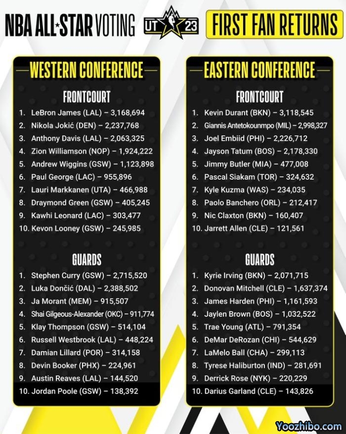 按照第一轮球迷投票结果,东部全明星首发是杜兰特、字母哥、恩比德、欧文和米切尔;西部首发则是詹姆斯、约基奇、浓眉、库里和东契奇。