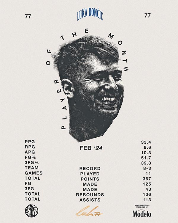 东契奇2月份率领独行侠取得8胜3负的战绩,场均得到33.4分9.6篮板10.3助攻1.8抢断。在11场比赛里,他有8场得分超过30分,3场得分超过40分,2月份的比赛中他还拿到3次三双。独行侠官方晒海报祝贺东契奇当选月最佳。这是东契奇生涯第四次当选月最佳球员,也是本赛季首次当选。