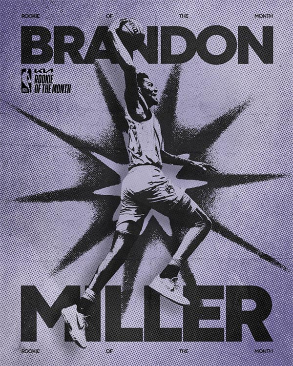 上个月,布兰登-米勒场均拿到20.5分4.5篮板1.8抢断,凭借出色的表现,米勒也蝉联东部月最佳新秀。