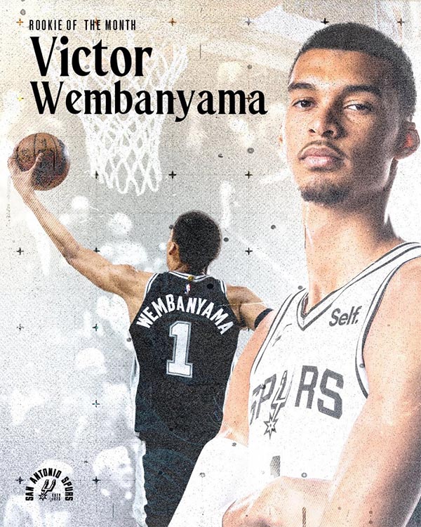上个月,文班亚马场均拿到21.3分10.7篮板3.9盖帽,连续2个月获得月最佳新秀,为冲击年度最佳新秀又添加一份荣誉。