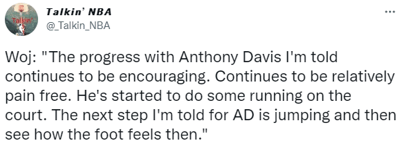 ESPN名记沃纳罗斯基在节目中透露,安东尼-戴维斯的恢复进展令人鼓舞, 他仍然是在相对无痛的状态下,他已经开始进行一些跑步训练,下一步的是进行跳跃训练,到时还要看看脚的感觉。