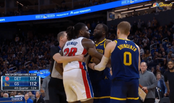 末节还剩1分24秒,活塞命中关键三分,格林在底线与斯图尔特发生争执,格林拉拽斯图尔特的球衣,之后斯图尔特也拉扯格林的球衣,两人互喷抱在一起,裁判第一时间劝阻他们,迪温琴佐、伯克斯等人也来拉开他们,裁判回放之后,吹罚格林和斯图尔特双双技术犯规。