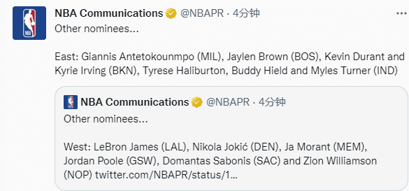 178直播01月03日讯 ,NBA官宣最新一周东西部周最佳球员,东契奇场均48+三双再次当选,波尔津吉斯也上榜,詹姆斯、杜兰特和欧文等球星获提名。