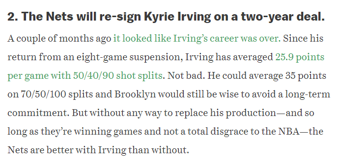 几个月前,欧文的篮网生涯似乎要结束了,但被禁赛8场回归后,欧文场均拿到25.9分,且三项命中率分别是50%、40%和90%,事实证明,篮网拥有欧文比没有他更好。