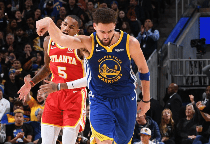 加时赛,汤普森手感依旧,勇士落后5分时克莱连得5分,生死时刻,汤普森持球单挑对手,轰进三分反超2分,此时克莱挥拳怒吼庆祝,库里冲上球场和克莱碰撞庆祝;之后特雷-杨两罚追平比分,勇士关键一攻,普尔脱手致命失误,错失绝杀两队打进第二个加时。