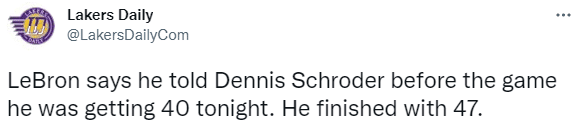 据报道,赛前詹姆斯告诉施罗德他要在生日夜拿到40分,最终老詹兑现诺言并且超额轰下47分。