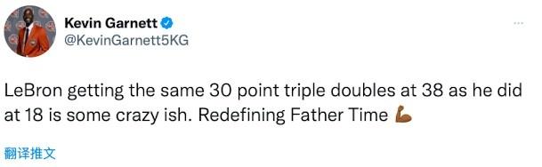 NBA名宿加内特发推称赞詹姆斯,写道:詹姆斯在38岁时拿到30+三双(已经40+),和他18岁时所做的一样,这很疯狂。重新定义了时光老人。