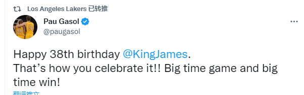 湖人名宿大加索尔发推为老詹送上生日祝福:詹姆斯,38岁生日快乐!这就是你庆祝生日的方式,重要的比赛,关键的胜利!