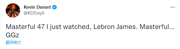 篮网巨星杜兰特发推称赞詹姆斯,他写道:“我刚刚看到詹姆斯砍下了47分,游刃有余啊...打得真好。